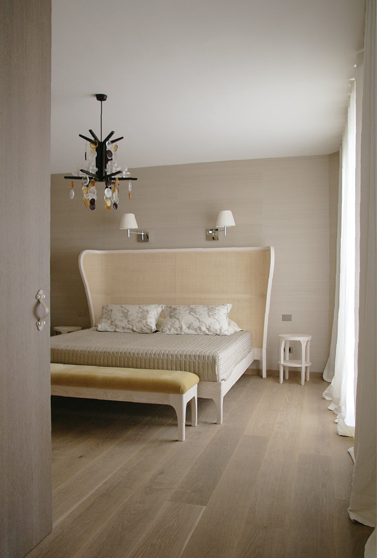 Elegant and timeless, this pied à terre apartment offers a serene retreat for its owner. A color palette reminiscent of nature, bleached oak floors and walls, natural fibres, and a carrara marble bathroom convey a non-ostentatious luxury feeling. Rooms open onto the Mediterranean terrace, planned like an outdoor living and dining room.